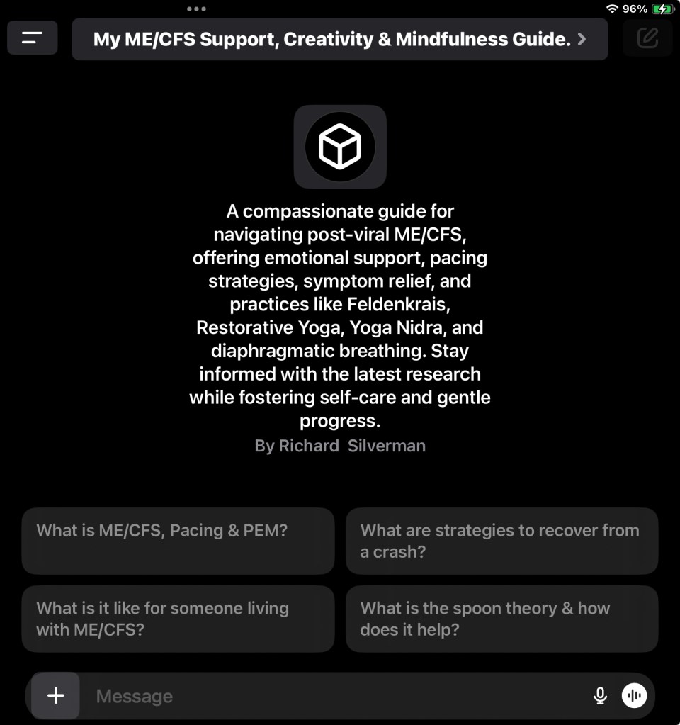 Check out this Free GPT ME/CFS Support, Creativity & Mindfulness Tool 😀