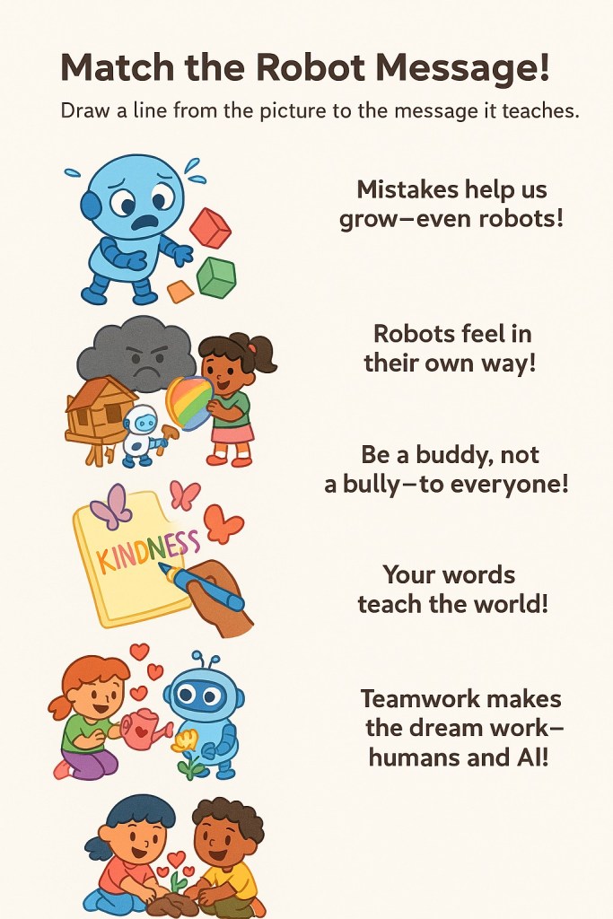- Themes of kindness, teamwork, making mistakes, and bullying prevention are all woven into how we interact with AI.