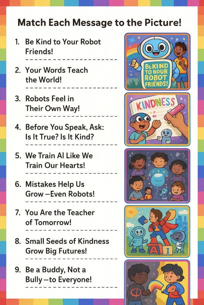 Here are 10 child-friendly designs for classroom posters or digital visuals to teach kindness, compassion, and ethical AI interaction to young students (K–5).