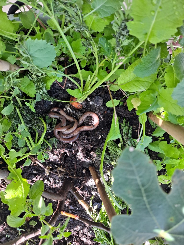 Over time, each quadrant becomes rich with castings—black gold. From these quadrants, we gently draw soil to grow trays of microgreens—tiny, living blessings. Once harvested, the roots of these microgreens are returned to the same quadrant, becoming the next meal for the red monks.