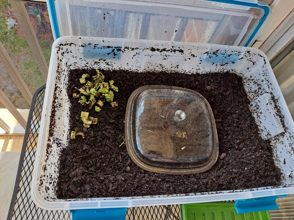 Rather than placing food atop their sanctuary, we offer it to the outer world—the quadrants around the central nest. Each week or so, depending on the rate of decomposition, we place small pieces of food (like celery, cucumber peel, or melon) into one quadrant. Then the next, clockwise.