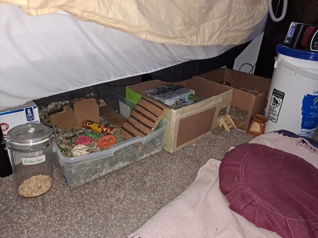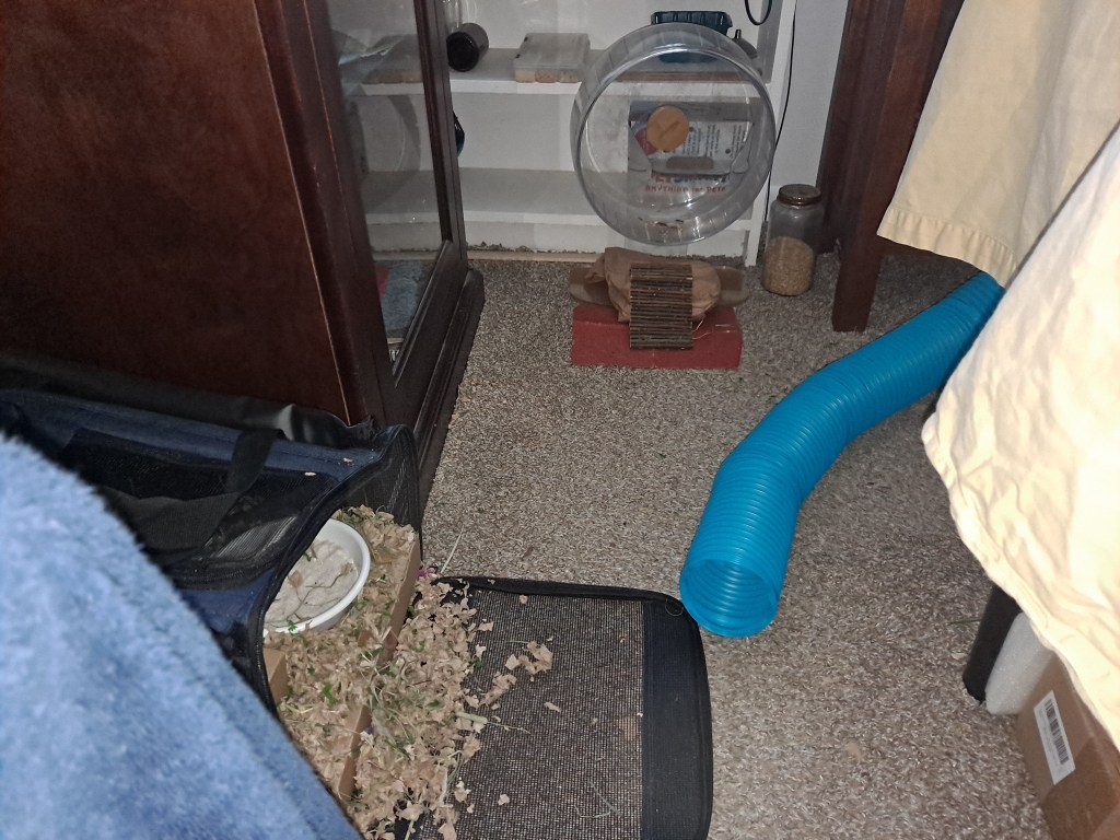 In the closet lies my royal chamber, where I nap upon the softest bedding. Disturb me at your peril, for I guard my sunflower seeds with great ferocity! 🌻⚔️