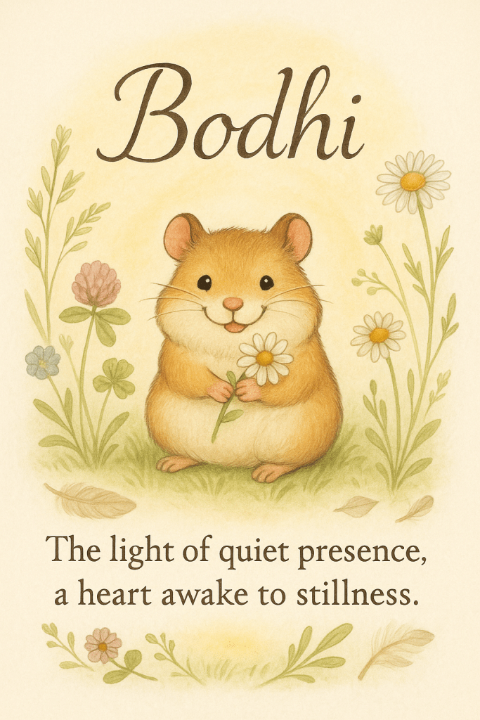 Bodhi does not ponder existence. She does not pause at the edge of her wheel, wondering if she should run or rest, nor does she hesitate before a peanut, questioning its worth. She simply is—a forty-gram queen, scampering through tunnels, nibbling with precision, reigning over her mustard-sheet mountains with a clarity that humbles me.